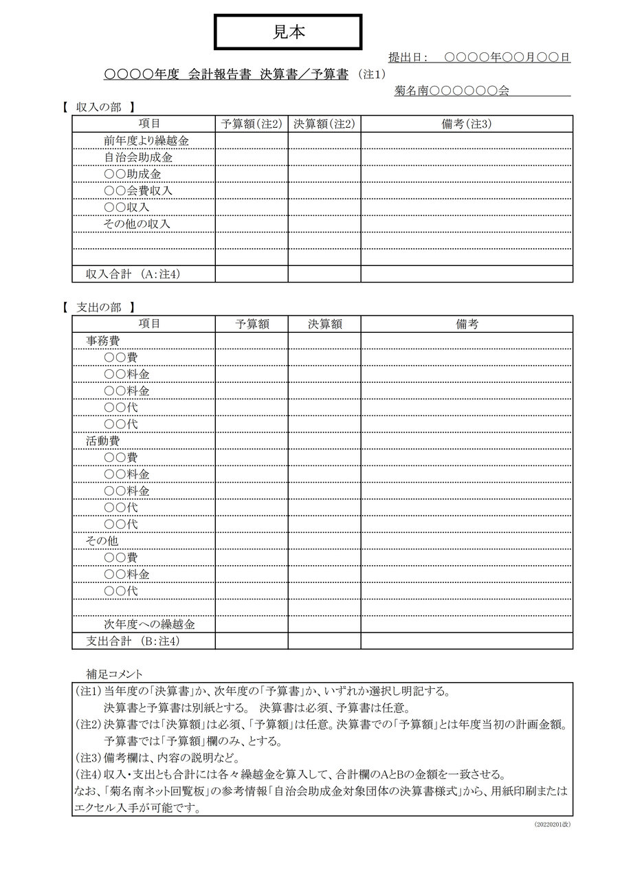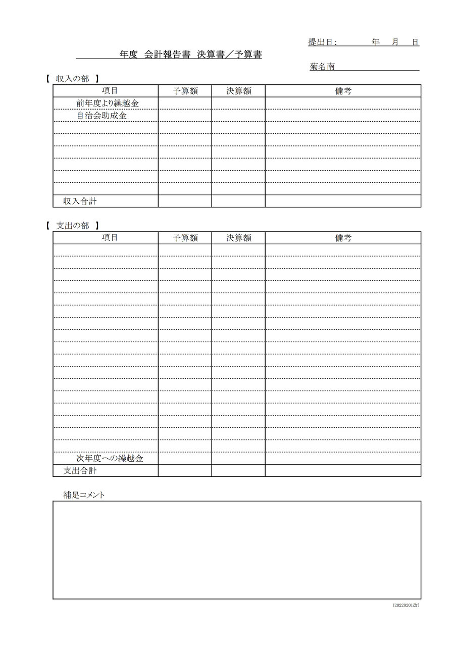 2021/02/01 自治会助成金対象団体の決算書様式 当自治会から助成金を受けている団体には毎年年度末に活動報告書と決算書を提出いただきますが、決算書について統一様式を設定しています。 以下の記入見本に従って作成お願い致します。 印刷して記入しても、エクセルをダウンロードして記入しても、いずれでも結構です。 なお、様式の基本構造が同じであれば、別用紙を使用しても構いません。 見本印刷はこちらから 用紙印刷はこちらから エクセルはこちらから 【見本】 【用紙】 < 前の記事次の記事 >
